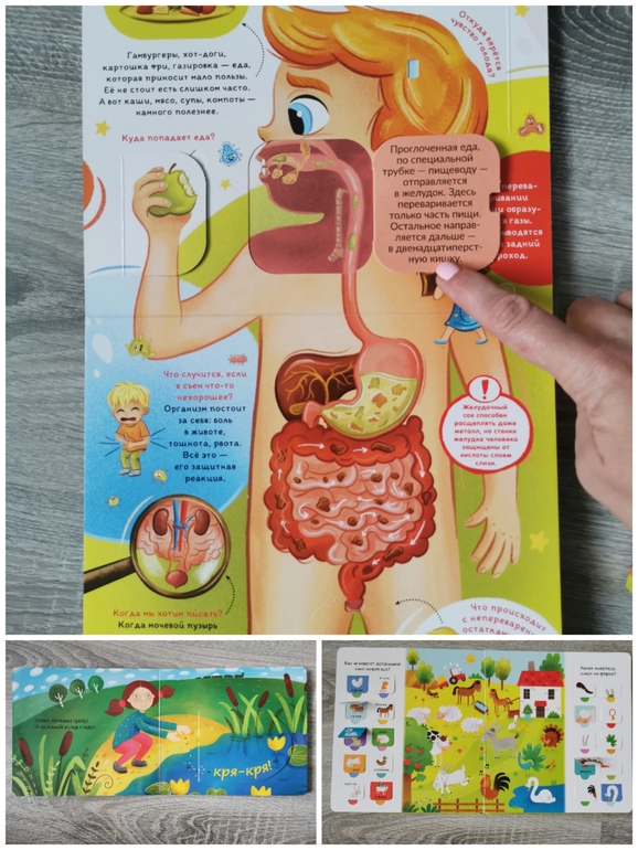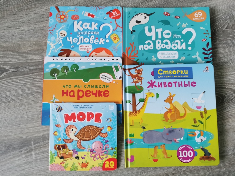 "Что мы слышали на речке" очень посредственная. "Створки для самых маленьких. Животные" - хорошая книга, с плотным страницами, с заданиями (у нас ещё есть "Ферма" из этой же серии, очень любима была), но почему-то не интересна ребёнку (хотя животных любит). "Как устроен человек" (Malamalama) несколько не по возрасту, но для первых знаний сойдет.