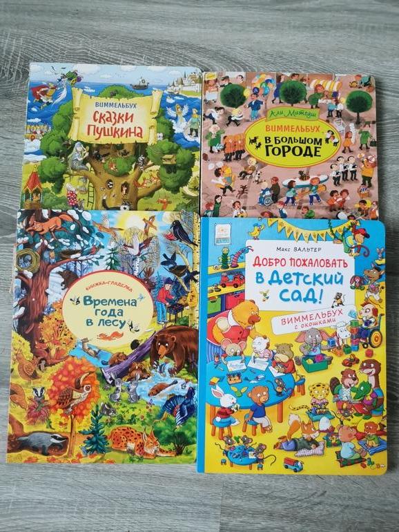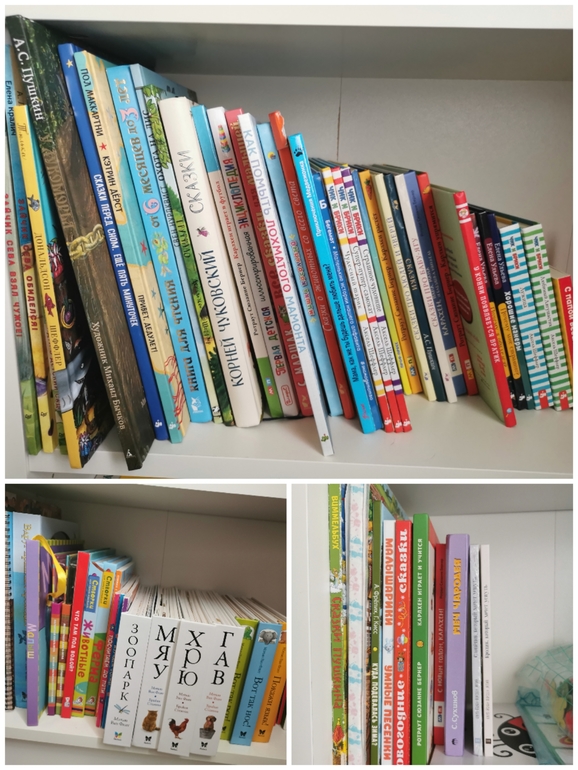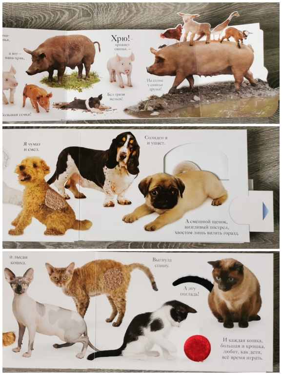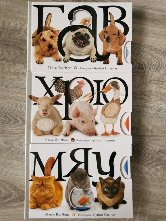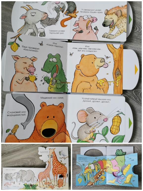 У маленьких книг толстые страницы, большие - для детей постарше (кто умеет переворачивать страницы аккуратно). Яркие, мало текста, надо немного додумать, объяснить ребёнку ситуацию
