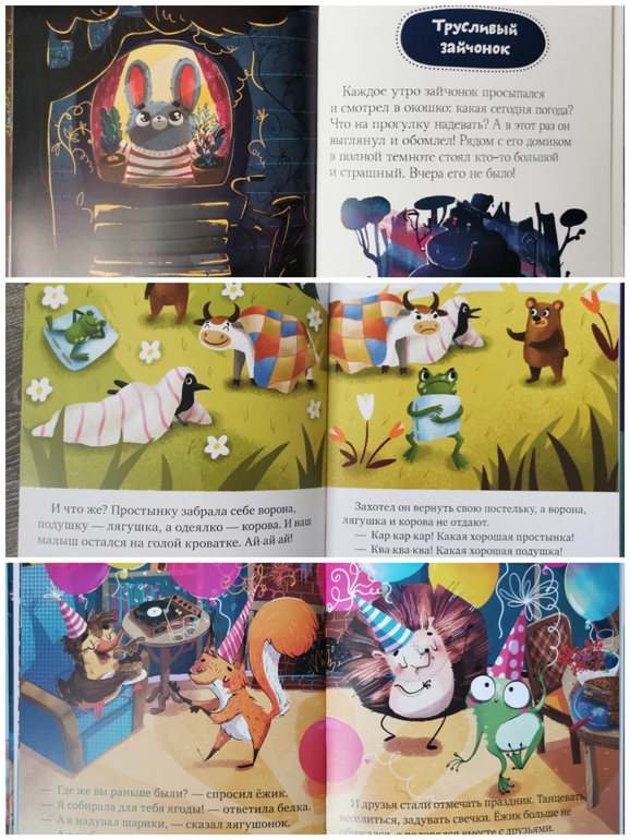 Остальные три были куплены вместе, неглядя. Все не очень зашли. К тому же, после прочтения сказки "Как медвежок не хотел ложиться спать" (книга "Хорошие манеры") , сын стал" проказничать" (медвежонок выкинул свое постельное в окно, мой пытается повторить тоже самое, но пока ограничивается кроватью).