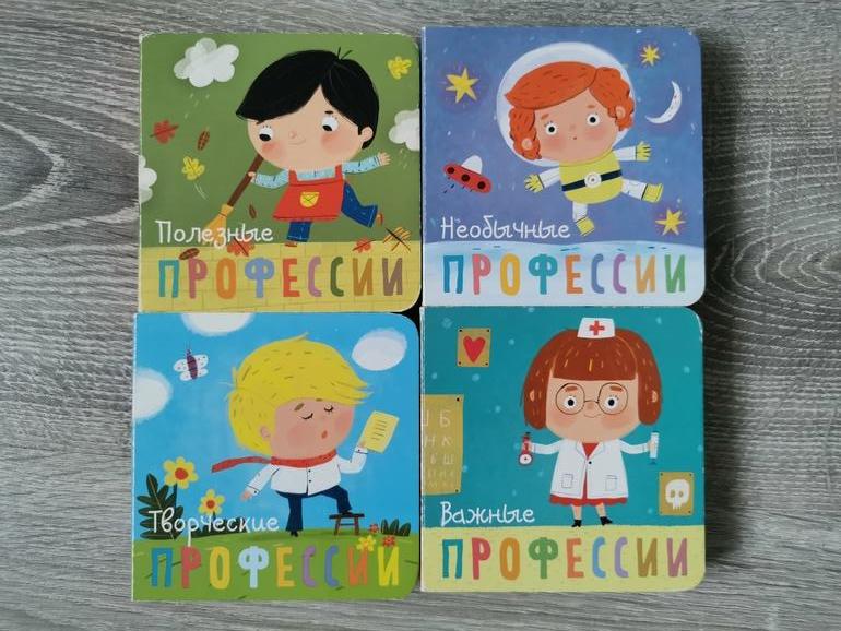 Книжки-малышки с плотным страницами, легко запоминающийся двустишиями. Лев почти сразу все и профессии запомнил, и в какой книге