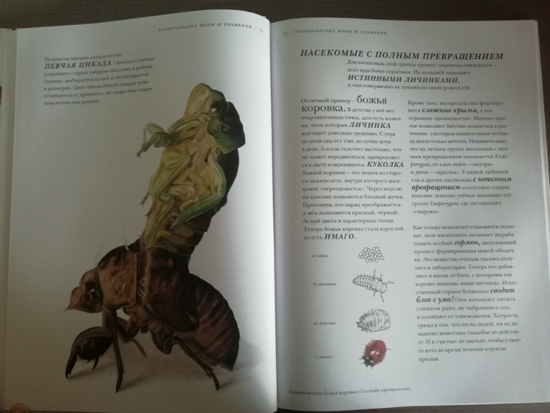 Для начала ребенок знакомится с классом насекомых и тем, как они устроены, а так же узнает как из яйца появляется насекомое. Это раздел в книге называется "Разнообразие форм и размеров".