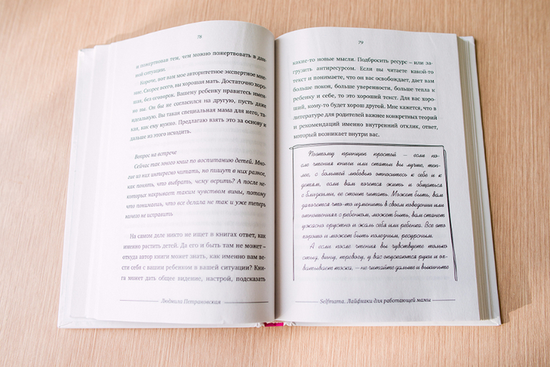 На мой взгляд, Людмила умудряется прекрасно проводить сеанс психотерапии со страниц своих книг (мы с мужем ревели в обнимку, дочитывая последнюю главу "Тайной опоры"). Так и с селфмамой, автор позволяет нам посмотреть со стороны на свою роль в обществе, семье, собственной жизни. В какой-то момент становится себя жалко, но не разрушительно жалко: "бедная я несчастная, что же делать дальше", а конструктивно: "я многое делаю для детей, семьи, я молодец, а себя не жалею порой совсем, не даю себе даже минуты отдыха".