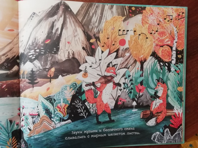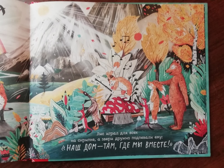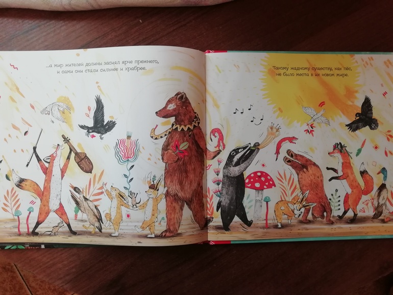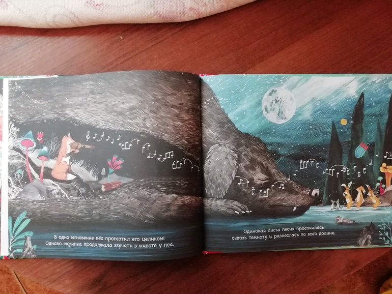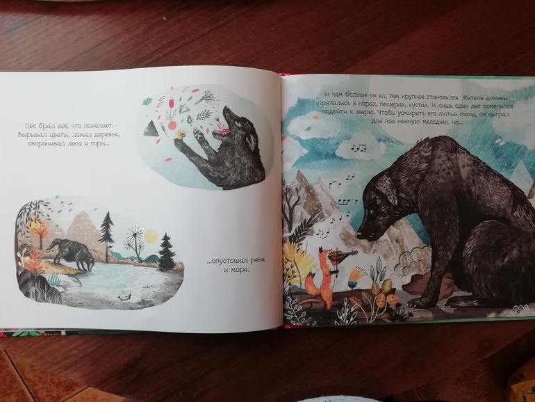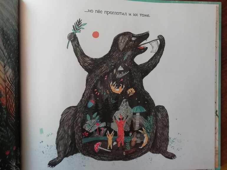 Когда-то люди считали, что мир держится на трех китах, на черепахе и других животных. Почему бы и не иметь место мифу о том, что мир возник в животе жадного пса, который поглощал все вокруг? Еще мне нравится мысль, что никогда не нужно унывать, в какой ситуации ты бы не оказался. Очень важно это привить детям, чтобы они не опускали руки и не пасовали перед трудностями. Звери могли сидеть в темноте и плакать, но они развели огонь и создали свой новый мир, пусть и в животе у пса. История детям понравилась, а иллюстрации к ней никого не оставили равнодушным, мы подолгу разглядывали их вместе.