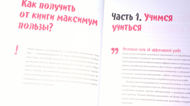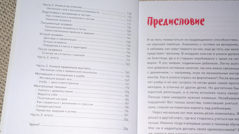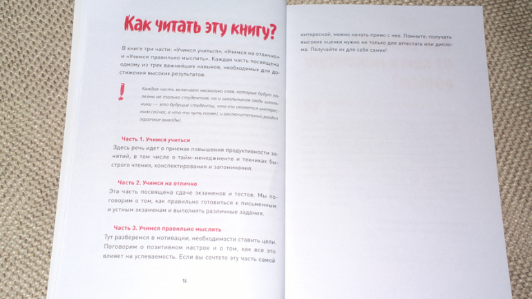 Книга разбита на 3 части: "Учимся учиться", "Учимся на отлично", "Учимся правильно мыслить".