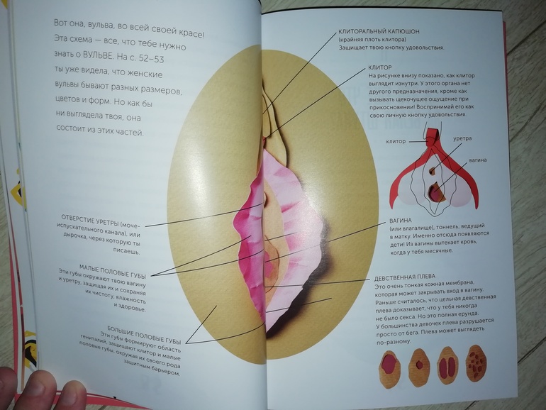 Мы с дочкой уже начали обсуждать женскую физиологию, она знает как выглядят и из чего состоят женские половые органы, у нас много энциклопедий по строению тела человека. Строение женских половых органов с помощью аппликации я вижу впервые. Для меня это выглядит как-то спорно, но рядом есть схематичная зарисовка вульвы.