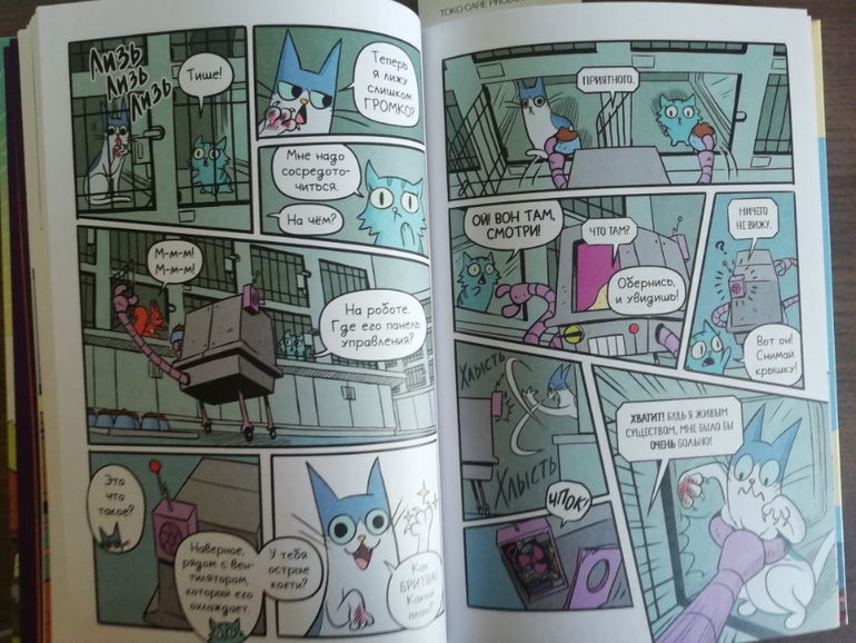 Но и это еще не все, самое удивительное, что историю дружбы двух кошек и их приключения нам рассказывает кошачий робот лоток.