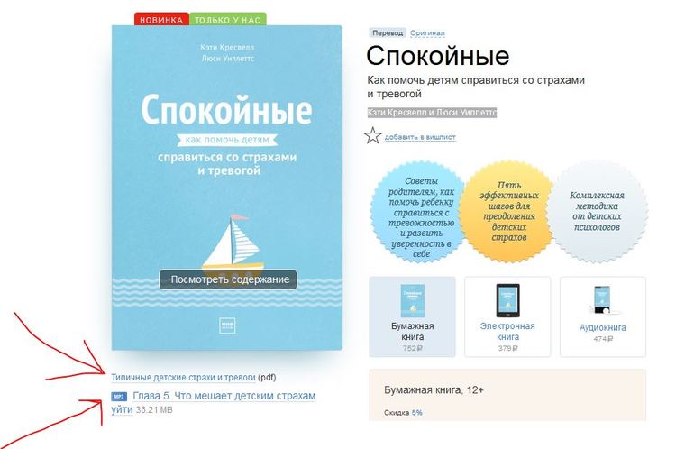 Обратите внимание, что на сайте издательства бесплатно можно прочитать главу "Типичные детские страхи и тревоги" и послушать в аудио формате главу 5 " Что мешает детским страхам уйти"