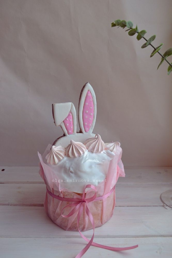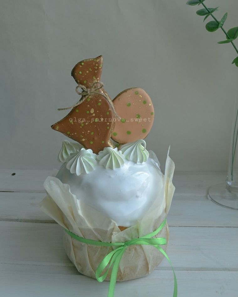 Куличи сдобные с изюмом украшенны имбирными пряниками и безе.