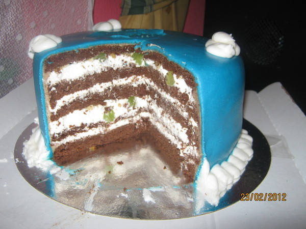 Вес 2,4 кг. Внутри: шифоновый шоколадный бисквит, апельсиновый крем, взбитые сливки с грецкими орехами и виноградом