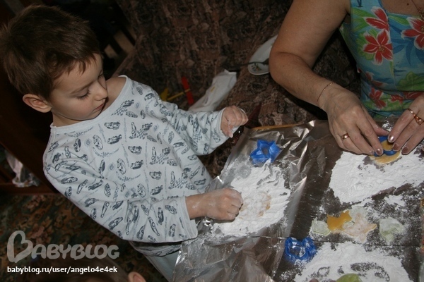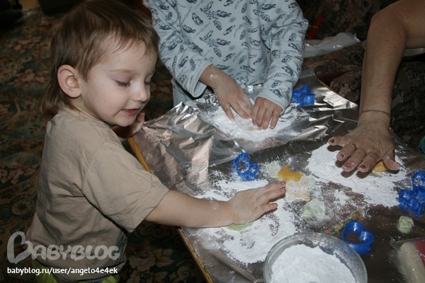 я всегда медовик с сыном вместе пеку! отрезаю ему кусочек теста и пока я пеку на торт он так же вырубками все делает)))) это здорово!!!!