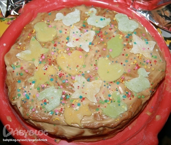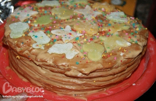 а я сам торт ночью пекла когда мои уже спали=)это мы утром укоашения делали вместе все=)да коржики очень тонкие получились,тортик очень сытный вышел больше кусочка нескушаешь=)