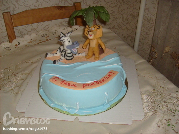 Сначала сделала пальму как на фотке, но она совсем не хотела держаться на торте, никакие палочки не помогли( Поэтому в итоге вместо пальмы сделала кустик, к которому прислонила льва:)