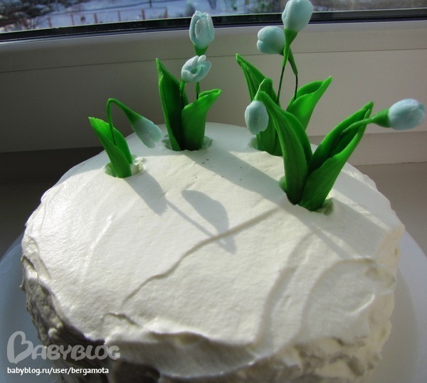 очень красиво, веснааа)))))) можно было еще если конечно была бы шоколадная крошка или шок.печенюшки - посыпать около подстнежников, типа земля видна, проталины)