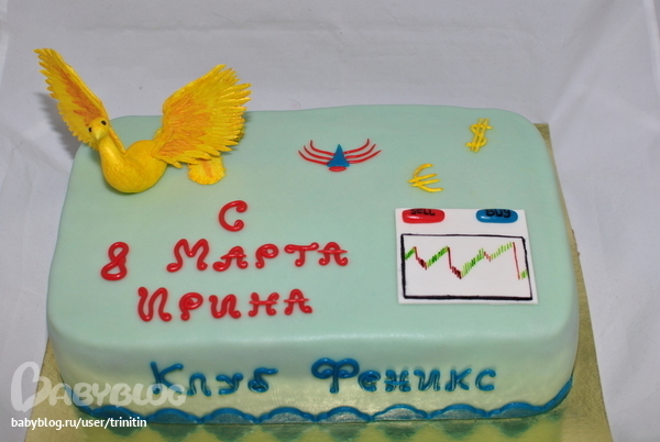 Тортик на 8 марта для руководителя клуба Феникс: птичка феникс, эмблема компании, график котировок, и значки валют
