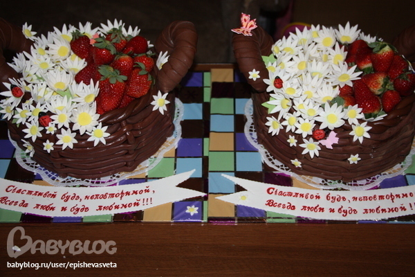 Торты для женщинЗаказали 2 одинаковых торта.Один на работу а один домой как я поняла.Внутри медовик,крем сметана со сливками+орехи+чернослив.Вес каждого 4.200кг.Клубника сверху настоящая.