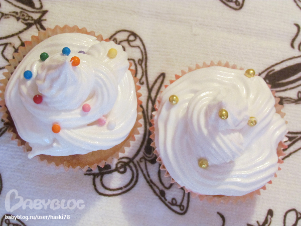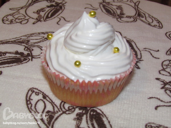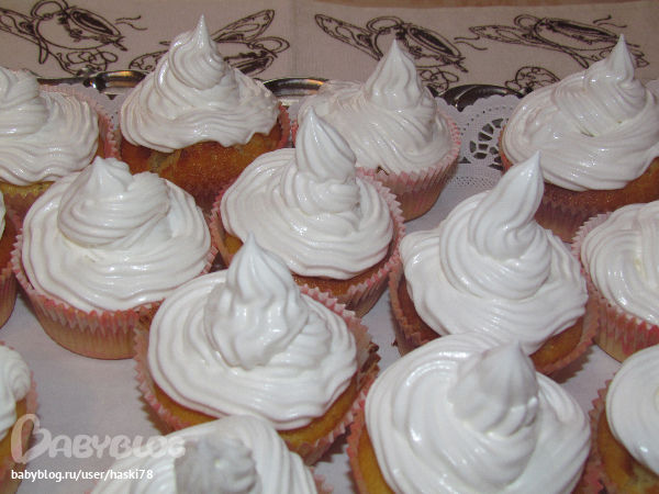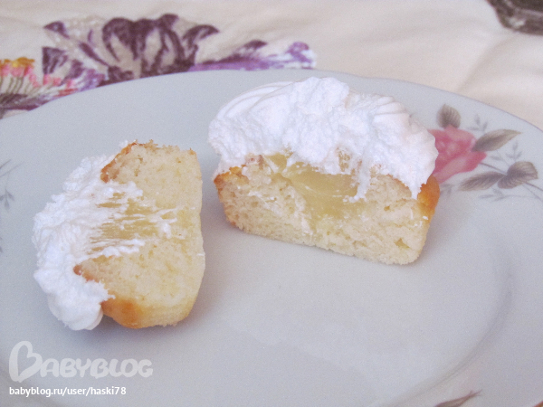 Юля:) спасибо ей большое! Ванильные капкейки с лимонным курдом и меренгой.Оччень понравились на вкус. Они и без кремов хороши)))