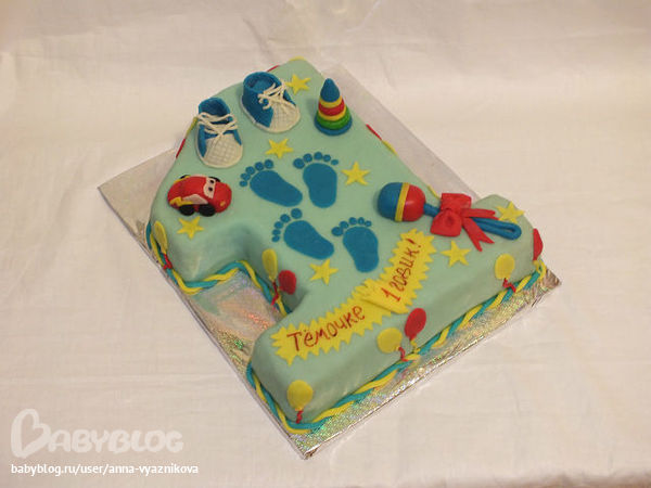Единичка ровная, хорошая. Ботинки, машинки, все хорошо. Меня смущает основной фон торта, он какой то грязноголубой или блеклый, не пойму, т.к. у фото освещение не очень хорошее.. Детский торт должен быть ярким, ну или цвет чистым. И лучше фотографировать все таки на какой то другой поверхности тортик.