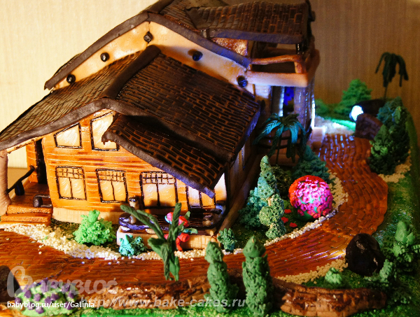 Девочки спасибо большое за комментарии!!!Дом весит 19 кг.Это уже вполне обжитой дом ,а не дача)))Делала его не отрываясь 2 дня.Хранила на балконе.Размер подставки не позволял поставить его в холодильник.Заказчикам понравился)))