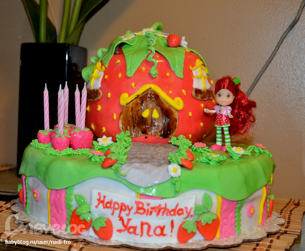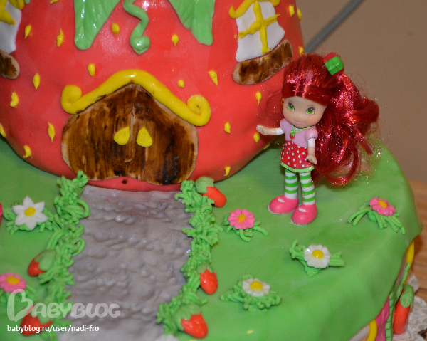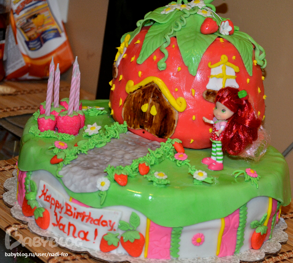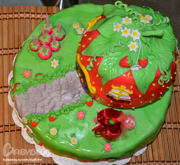 ванильно-шифоновое суфле, клубнично-сливочный крем, клубничное суфле,прослойка ягод в сиропе и пропитка тож - клубничный сироп. Вечером позвонили заказчики, сказали СПАСИБО и что остались довольны..как внешним оформлением, так и внутренним содержанием. Мне приятно.. только вот я никак не научусь делать красивые надписи((( подскажите как исправить..и хотелось бы конструктивной критики..что нитак так.. кстати, после того..как поставила домик..суфле стало выбирать(((