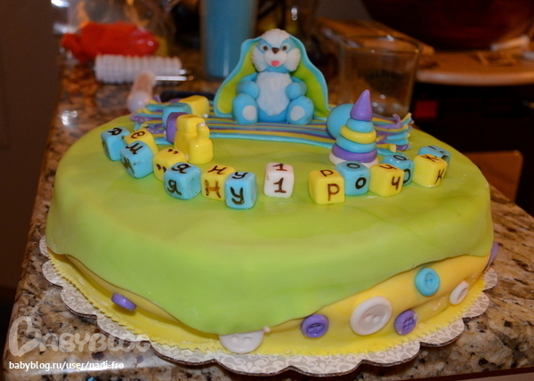 торт делала подруге сыну на годик..типо в подарок..радует хоть деньги не взяла.. и то что они довольны..т.к им видно это не показалось так ярко заметным...бисквит. не очень получился..тяжеловатый - эт раз.. крем с какого фига сливочный.. т.е крем..потом ягоду в сиропе сверху (нет бы суфле сделать) или ягоду вниз..потом этим же кремом.. сверху под мастику..торт осел.. потому уже начал сверху мокнуть.. гости вроде этого ничего не заметили..хвалили..а мне прям стыдно было это слушать(((