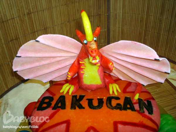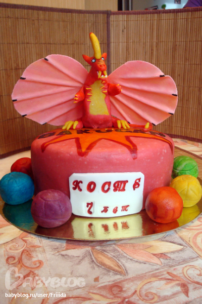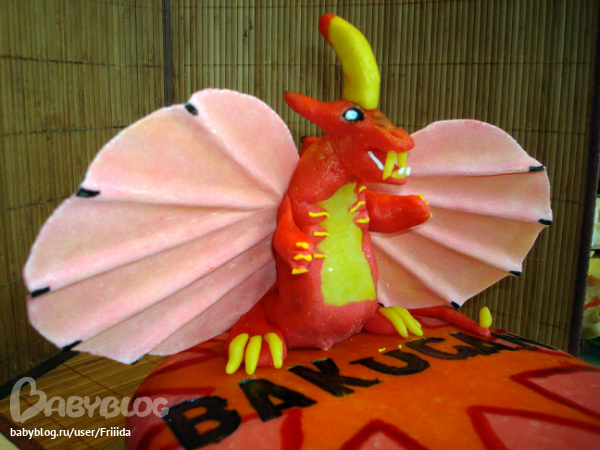 бисквит медовошоколадный,крем шоколадный,пропитка шоколадным мороженным, покрытие и сам Драго а так же бакуганчики марципановые.