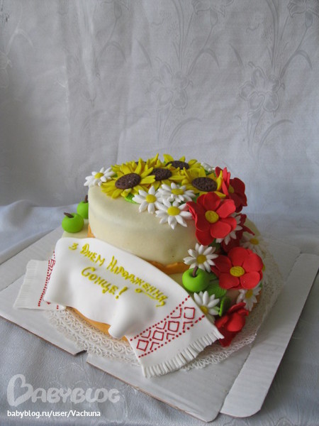 Внизу медовик с грецким орехом и вишней,наверху шоколадно-кофейный шифоновый бисквит+маскарпоновый крем+клубника.Марципан.
