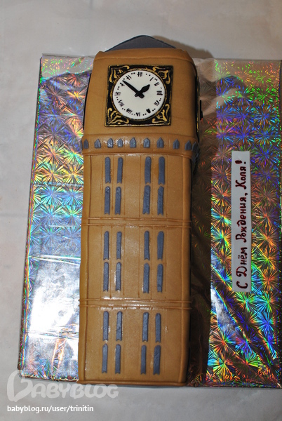 Этот торт привел меня в разочарование. Началось с того что заказали торт с Биг Беном - предложила круглый с башней. Потом подумав решила и предложила сделать 3-д торт в форме башни со зданием. Стала делать - и тут началось - бисквит проседал под башней (хотя основание выдерживала под прессом), башня получалась такая шаткая, что я побоялась что ее просто не довезут - так как ее высота получалась около 30 см. Вообщем пришлось делать лежачую башню. По длине шпиль невходил и вообще деталей много не получилось((