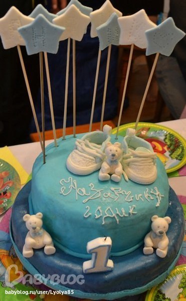Нам 15 апреля был годик!!! Я делала торт из мастики для гостей, свечка была цыфрой, а именинник жевал рядом сыр!