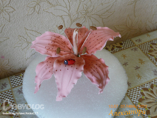 у меня часа 2 сушился, но ве равно не очень хорошо высох. А лепестки для лилии вообще больше суток сохли. А потом в цветок я их собирала на шарике мастики для обтягивания, другого не придумала, и они держались не очень хорошо. Может, как-то по-другому надо было? Извиняюсь, что засыпала вопросами, просто хочется научиться по-человечески делать