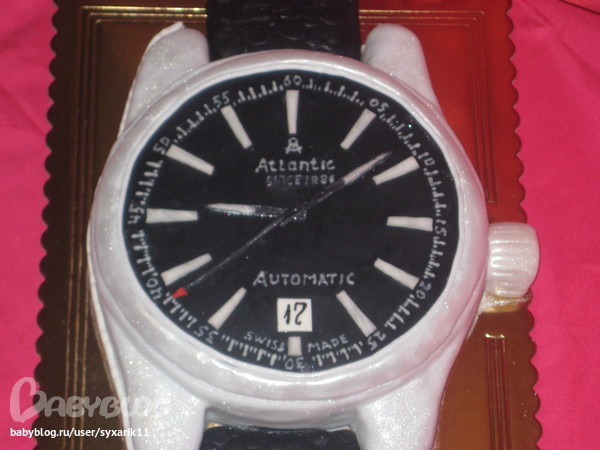Вы себе не можете представить, какой тортик вкуснющий!!! А часы такие же, как и оригинал!!! Муж был просто шокирован!!! Ремешок у часов это тоже торт!!! А знаете какой минус у этого торта??? Не смогли оторвать надпись - так хорошо она была приклеена!!! ОДИН БОЛЬШОЙ ВОСТОРГ!!!