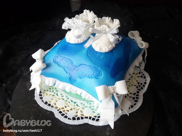 Торты детскиеДумала, что мода на подушки уже прошла, а также и на пинетки, и меня сея чаша миновала. Однако заказали подушку с пинетками и в рюшечках и сбантиками. Вот что из этого получилось. Шифоновый бисквит, крем маскарпоновый с вареной сгущенкой. Вес 2,7 кг.