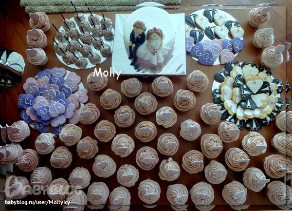 Торты свадебныеСвадебный заказ. оформление кэнди бара и свадебной горки. На фото, тортик бананово-вишневый, печенье американское сахарное с инициалами молодоженов и сердца-парочки, а так же ванильные маффины, с заварным малиновым кремом и джемом внутри и воздушный шоколадный крем на основе белого бельгийского шоколада) А так же конфеты шоколадно-ореховые.