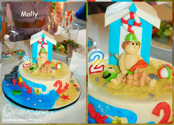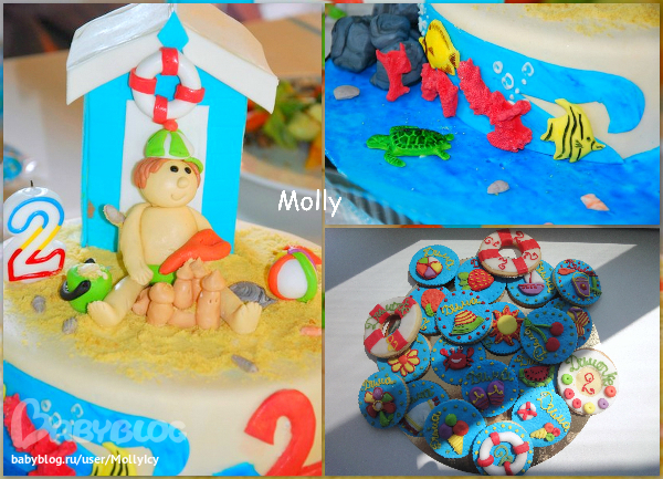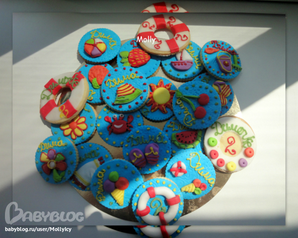 Торты детскиеНаконец то не обошла вниманием и свою семью)) Сделала все как задумала. Получился морской летний торт и печеньки-подарочки гостям)