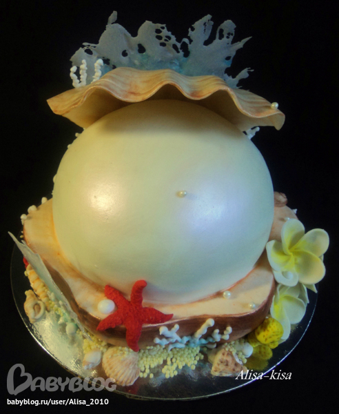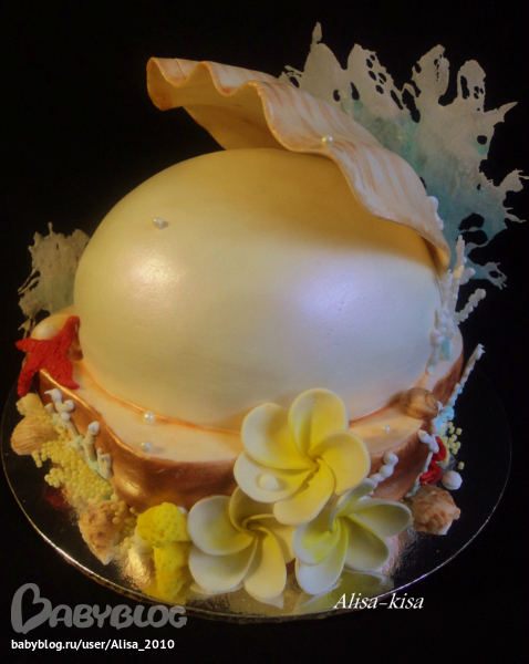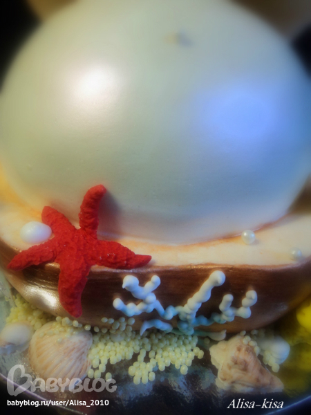 Эль, во-первых форму торту придать нужно изначально до покрытия кремом под мастику - жемчужину сделать идеально ровной, вырезать все выступы, это не в 2 яруса торт, это торт единой формы, потом при покрытии мастикой - сделай слой потолще - все четко стеком продави, а красить нужно в 2 слоя, не очень сильно кандурин наводила - достаточно небольшого блеска, главное раковины оттенить - там у меня коричневый кандурин. потом губочкой примокнула чтоб разводов не было.