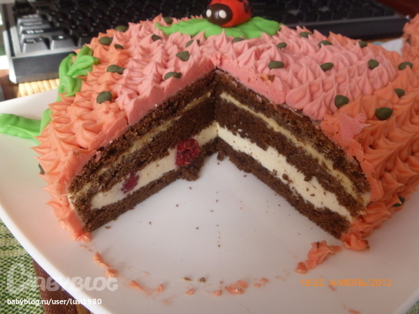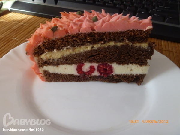 Внутри шокошифон, крем1-Тирамису(покупной, вчера остался от капкейков, жалко было выбрасывать)))), крем2-суфле "Птичье молоко" со свежей малиной, пропитала-сгущёнка+вода.