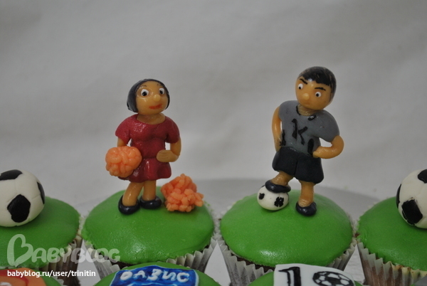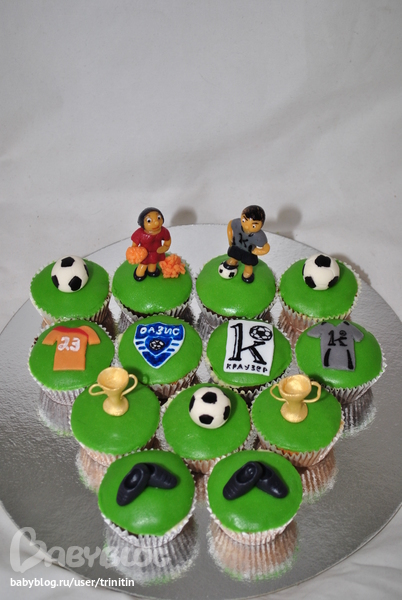 И футбольные капкейки - 25 шт, ванильные с орешками, шоколадные, банановые с шоколадной стружкой. Футболки и эмблемы команд, в которых играет именинник.