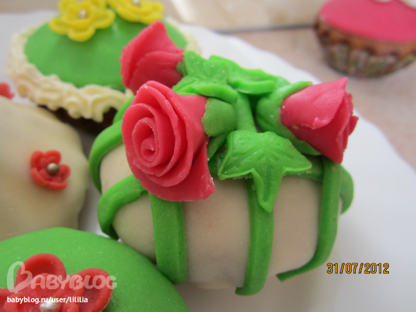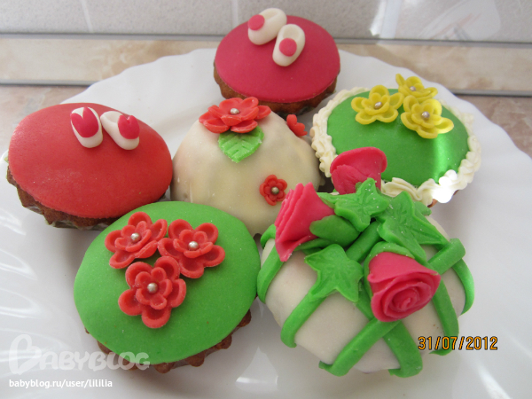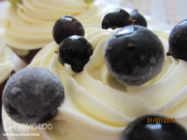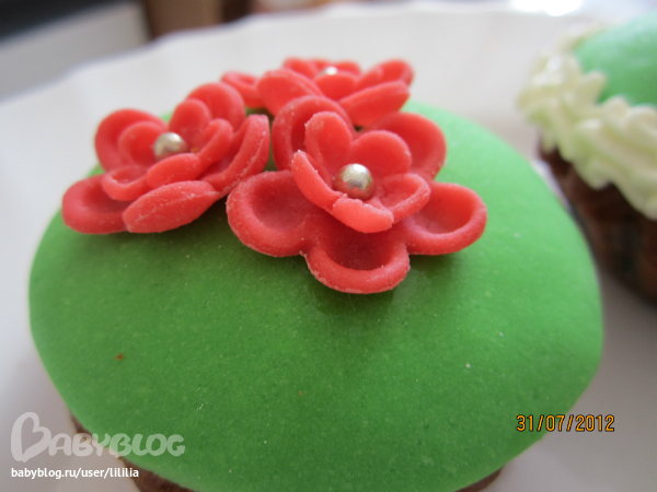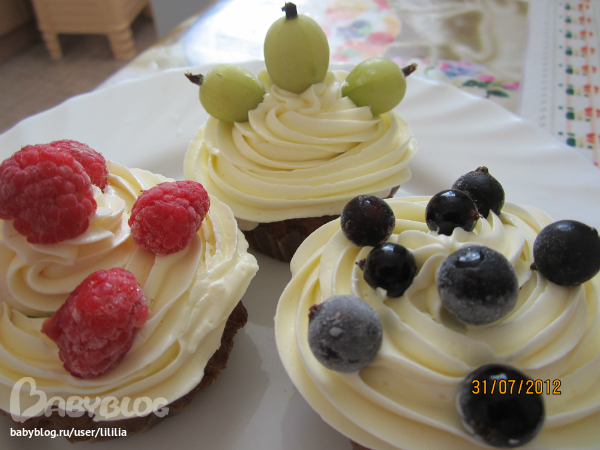 В первый раз сестра испекла капкейки, украшенные мастикой. Вот что у нас получилось!!! Ягод свежих не было, пришлось класть замороженные)) Это мы просто для себя делали))