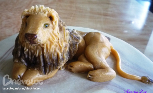 Наташенька!Спасибо за подробный ответ,блин..модела нет,я думала ты его из марципана слепила,но очень похоже,недождавшись от тебя ответа,начала лепить,незная как к нему подступиться...начала с головы и гривы,(леплю из марципана)намучалась с мордашкой,ну не могу пропорции рассчитать.В общем слепила мордашку и наложила гриву частями,тоже пластмассовым ножом прорезала,грива мне нравится,а вот теперь глаза нужно посадить в глазницы,а я прям боюсь...даже глазницы делать и то страшновато испортить мордашку...В общем марципан закончился,нужно ехать покупать,долепить туловице и задние ноги.В общем лежит у меня на передних лапах голова с гривой))))))Ты извини если замучаю тебя по ходу лепки вопросами...но я вообще не увлекалась лепкой,а вот пришлось...Спасибо ещё раз огромное!
