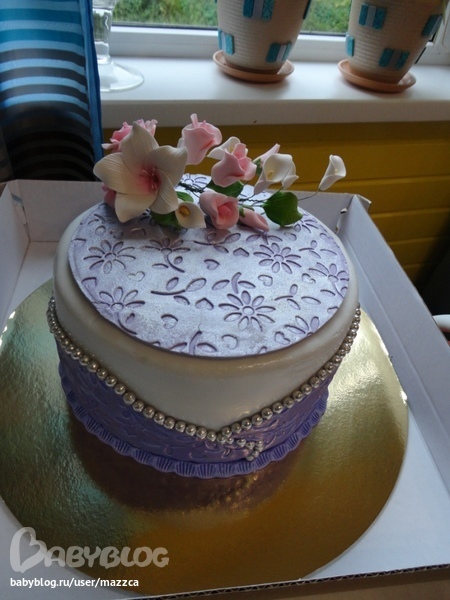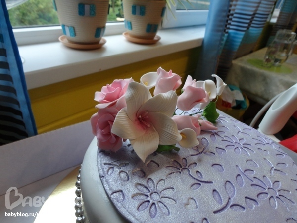 Он хоть и пятый, но во многом как первый. Цветы вымученные. Лепила их долго по фотографии сахарных букетов. Кучу раз переделавала. Но вроде вышло не плохо. Извиняюсь за фотки(( Очень торопились.