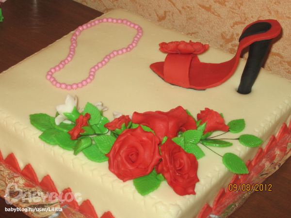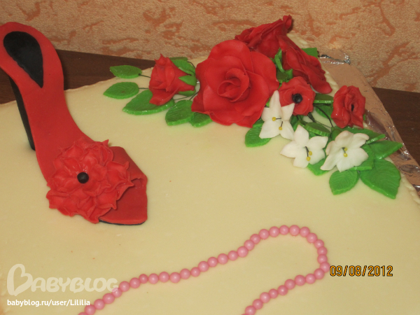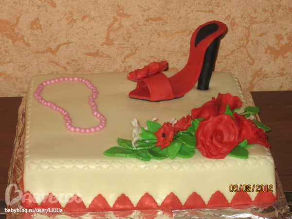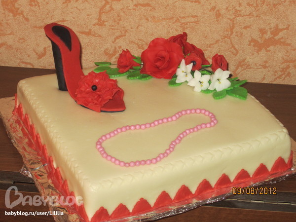 Торты для женщинВ первый раз делали квадратный тортик, покрытый мастикой. Спасибо девочкам за МК, которые нам скидывали!!! Ой, девочки, и как же вы делаете в такую жару такие цветы и другие фигурки??? У нас все текло!!! Цветы таяли буквально в руках!!! Туфля бедная чуть не разваливалась!!! Невозможно было работать. Внутри медовый тортик с фисташками и вареной сгущенкой. Покрытие молочная мастика, а цветы и туфелька - покупная для лепки цветов. Но и она ужасно таяла в руках!!! Ой, еще, если не сложно, подскажите, как правильно крепить туфлю к торту, потому что наша начала заваливаться на бок, в каблук засунули зубную палочку, и та не держала)) Пришлось каблук немного впихнуть в тортик!!!(( Тортик и цветочки делала сестра, а туфельку я))