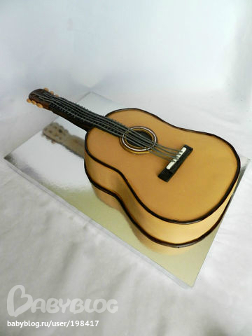 бисквит со сгущенкой вареной)))Точно размеры не помню,знаю точно,что сама гитара без грифа -длиной 22см,гриф примерно 16см.Не бойся,я кстати,думала,что намного сложнее будет,но сделала ее очень быстро)))