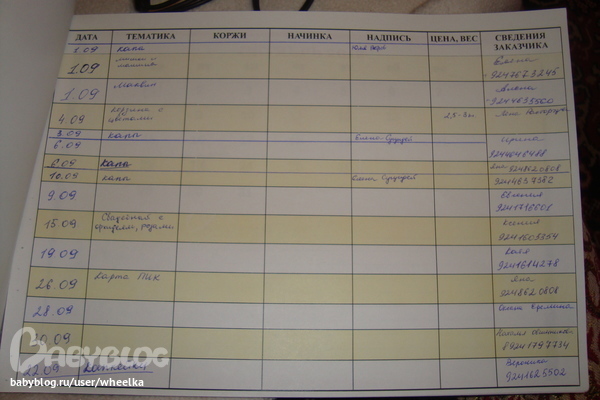 сначлаа писала в ежедневник-не то)) потом в тетрадку-не то)) теперь я сделала в компьютере себе 2 вида листиков-на 1 календарь и строчки для записи числа. имени и телеофна заказчика, а на 2 листе уже более подробная информаци (дата, тематика/дизайн, коржи, наичнка, надпись,   цена/вес и сведения заказчика) и заполнять желательно карандашом и в запасе иметь ластик)) чтобв случае изменений подтер и все)) вот так это выглядит в идеале вот так заполнять аккуратненько а теперь ВНИМАНИЕ! ТА-ДААММ! вот так быть не должно)))) но у меня август еще хуже заполнен))поэтому показываю сентябрь))))да и доча карандаш украла)))