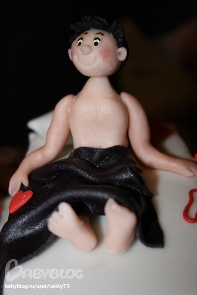 Я сама не умею делать торты из мастики. Но у нас есть в городе классный мастер. Вот такой тортик она сделала по моей просьбе на День Рождение моему тогда еще будущему мужу. Только я немного кроворукая, поэтому пока везла сломала ажурную спинку от кровати. Одеяло у мужчины снималось. По моей просьбе онтам в трусах )))