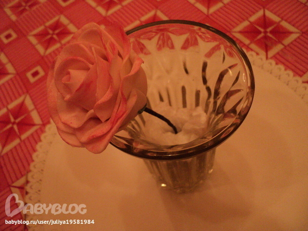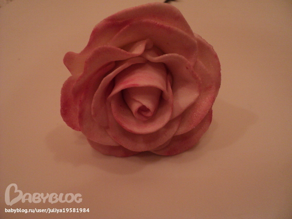 Умничка! отличная розочка! и бутон удался. мне кажется, единственное, что нужно было чуть побольше лепестки делать для внешних слоев, ну и слегонца потоньше раскатывать, а так вообще супер!