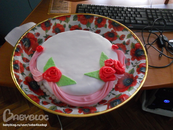 По торту - выровнять в следующий раз поглаже, особенно переход на бока. Мастику чуть покруче замешивать - складочки будут лучше получаться, у тебя они провисли и сошлись все вместе.