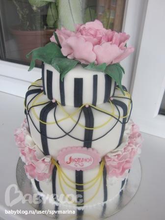 Торты для женщинЗамечательный молодой человек попросил сделать тортик для своей любимой супруги- "чтобы ей было приятно"! Я думаю, что даже если бы был не этот торт, а какой-нибудь пирог с вареньем, ей было бы тоже очень приятно! Вот такие бывают мужья!!! Времени на оформление было уж очень мало- всего 2 часа, с учетом обтяжки.