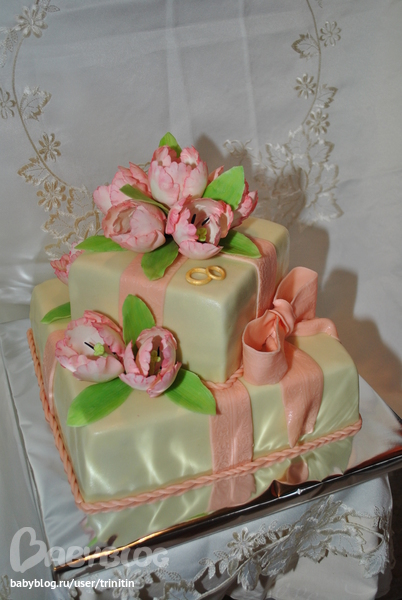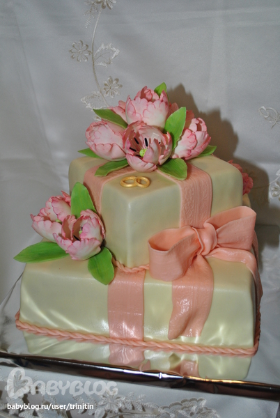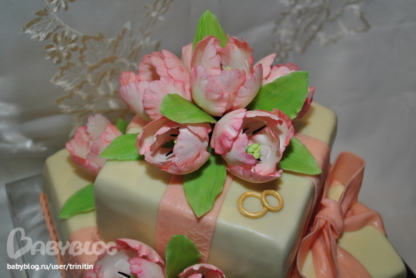 Олечка, наконец я добралась до компа, чтобы написать тебе слова благодарности, от всех кто этот торт видел и пробовал. Особенно от жениха с невестой. Очень чуствовалось (впрочем как и всегда), что ты вложила всю душу в него. В живую этот тортик еще красивее, чем на фотках. Тюльпаны выглядели настолько живыми, что гости не сразу решались их попробовать.