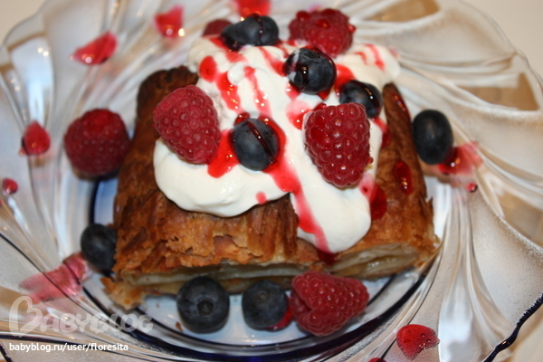 Печенье,пирожные,конфеты, выпечкаЧто-то устала на ночь объедаться тяжелой пищей..решила порадовать себя яблочным штруделем..внутри яблочки,изюм,орешки,сверху сметанка и ягодки
