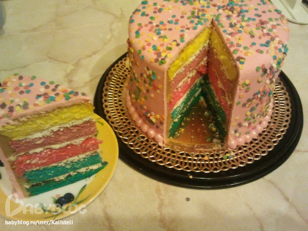Торты детскиеПопросила доча тортик "Радужный", девчонкам-подружкам чайку попить)))))на оформление не смотрим, делала на скорую руку... просто хотели проэксперементировать с разноцветными коржами)))