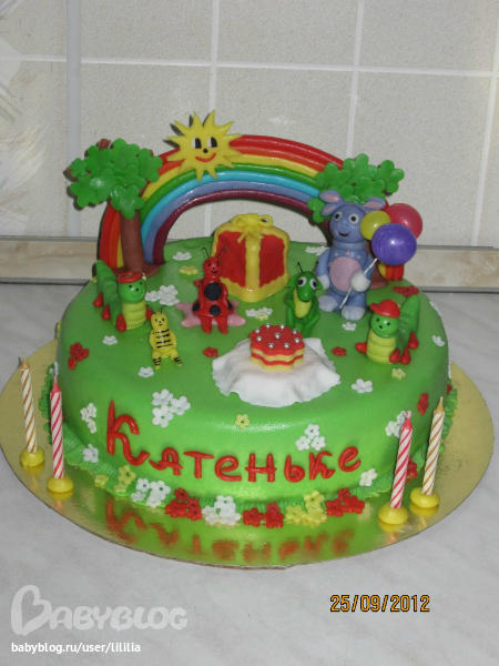 Торты детскиеВторой по счету тортик с Лунтиком и Ко. Внутри ванильный бисквит, крем сгущеночный, начинка ананас. Мастика молочная. В подарке медовичок. Радуга, к сожалению, начала падать, пришлось подпереть деревьями, благо они заранее были сделаны для другого тортика)))) Работа сестры. Вес 2,8 кг.